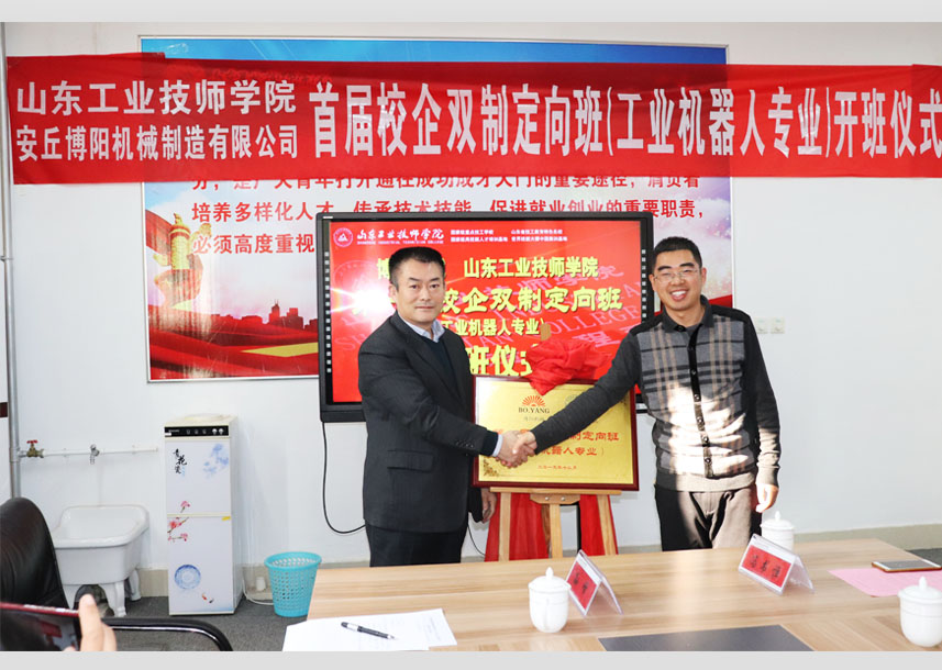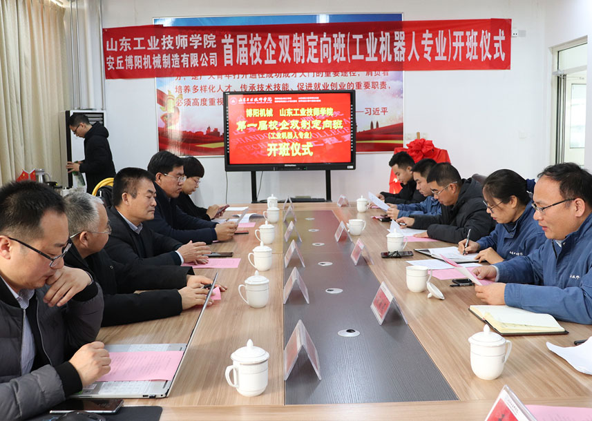 2019年12月24日上午10點,首屆“博陽校企雙制定向班(工業(yè)機(jī)器人專業(yè))”開班儀式在山東工業(yè)技師學(xué)院舉行,山東工業(yè)技師學(xué)院教務(wù)處李新功處長參加并致辭,現(xiàn)代制造工程系周明鋒主任與閆吉祥總經(jīng)理進(jìn)行揭牌,并為孫紅金副總經(jīng)理頒發(fā)“博陽校企雙制定向班”班主任聘書,閆吉祥總經(jīng)理為周明鋒主任頒發(fā)博陽機(jī)械“技術(shù)顧問”聘書,齊魯理工大學(xué)王佐勛教授及公司郭偉總經(jīng)理、李文明副總經(jīng)理一同參加活動。